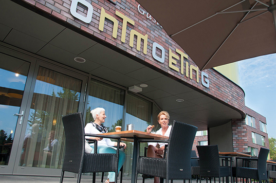 Gasterij De Ontmoeting hoort bij een woonzorgcomplex. Maar ook buurtbewoners kunnen aanschuiven. De mosgroene letters beelden een tafeltje met stoelen uit.