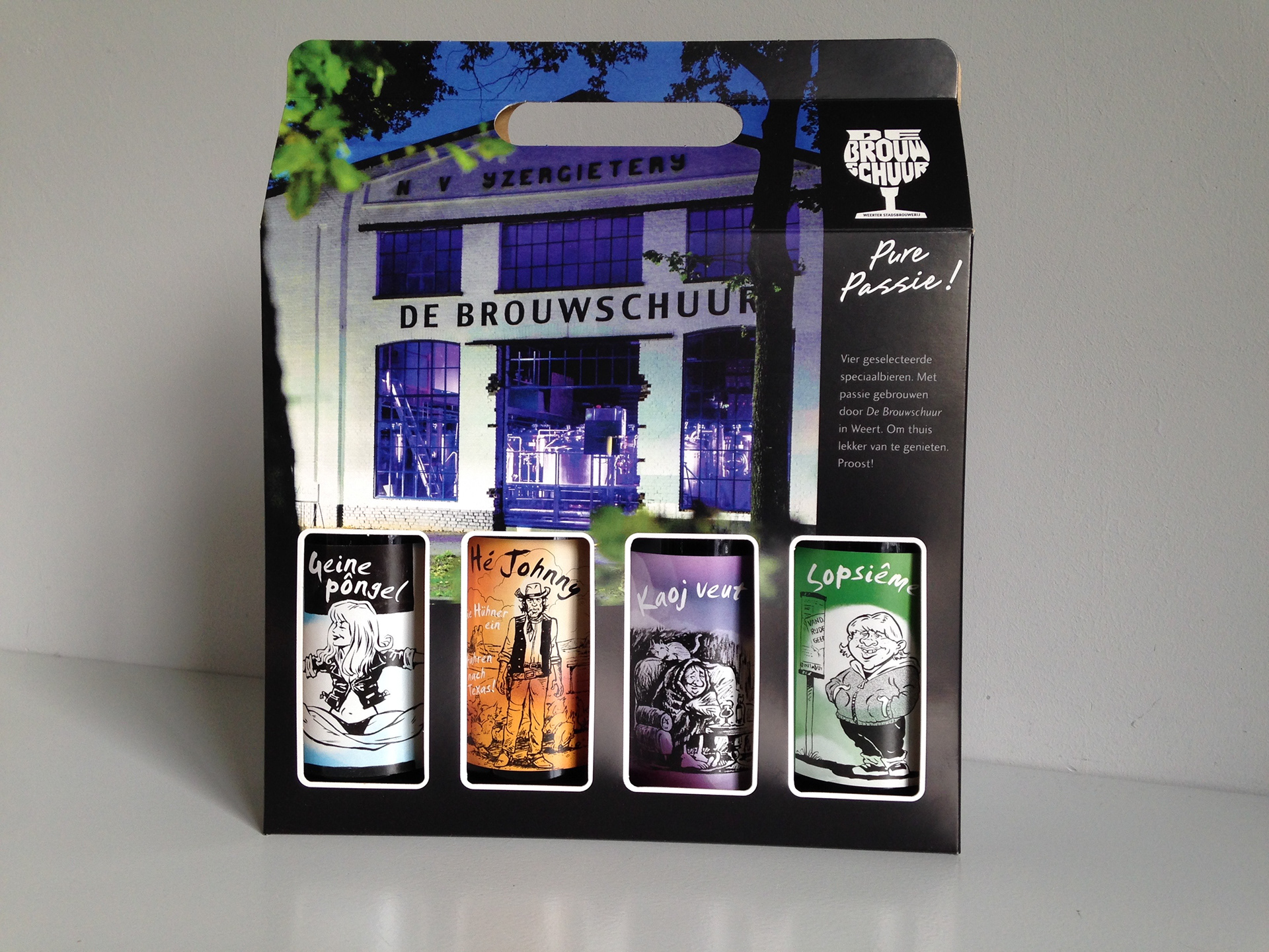 Humoristische etiketten in samenwerking met een illustrator. Ieder biertje zijn eigen kleur, zodat de barman in één oogopslag ziet wat hij hebben moet. Ook de teksten aan de zijkant worden door Beeldkracht verzorgd. Nu met mooie cadeauverpakking, uiteraard ook door Beeldkracht ontworpen.