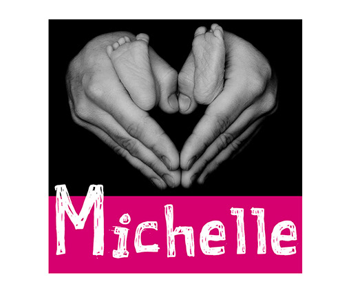 Al snel na de geboorte is deze foto gemaakt; de voeten van het kleinte in de handen van de papa vormen samen een hartje. Aangevuld met knalroze en een speels lettertype.
